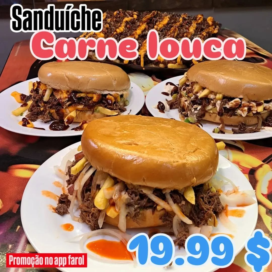 carne desfiada, queijo, cheddar, catupiry, tomate, alface, maionese, mostarda e molho da casa